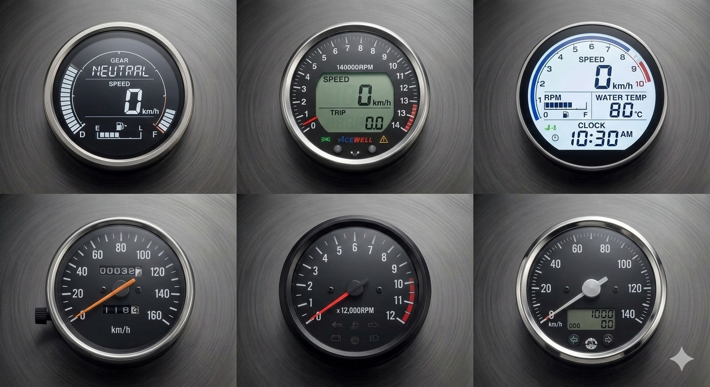 - タコメーター・・・機械式(シリンダーヘッドのギアからケーブルで回転を取り出す)は非常にレアでSR400等のごく一部の車両のみに使用されている。それ以外の車種にアフターパーツのタコメーターを取り付ける時は、プラグコードにセンサーとなる配線を巻きつけたり、イグニッションコイルから配線分岐させて、点火時のパルスを拾ってエンジン回転を表示する電気式タコメーターを使用する。点火回数とエンジン回転数の関係は、メーター側のディップスイッチやボタン操作で設定できるようになっている。